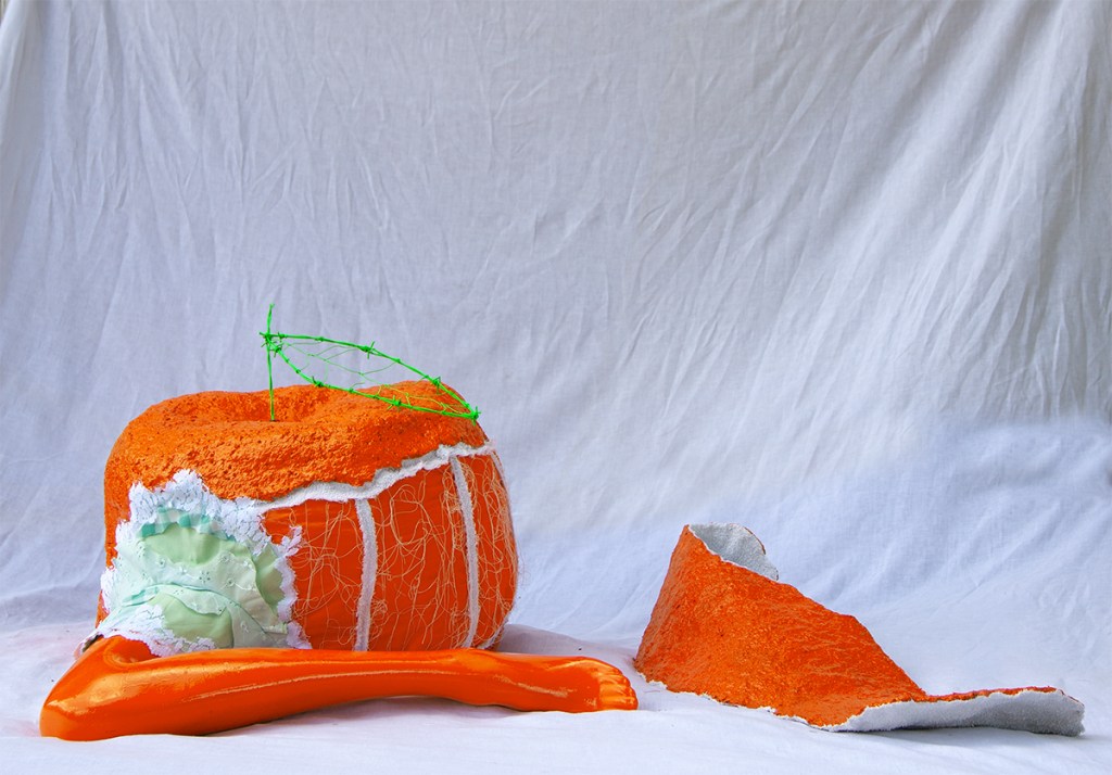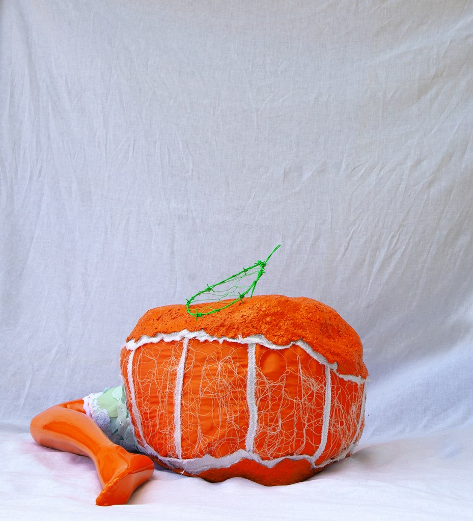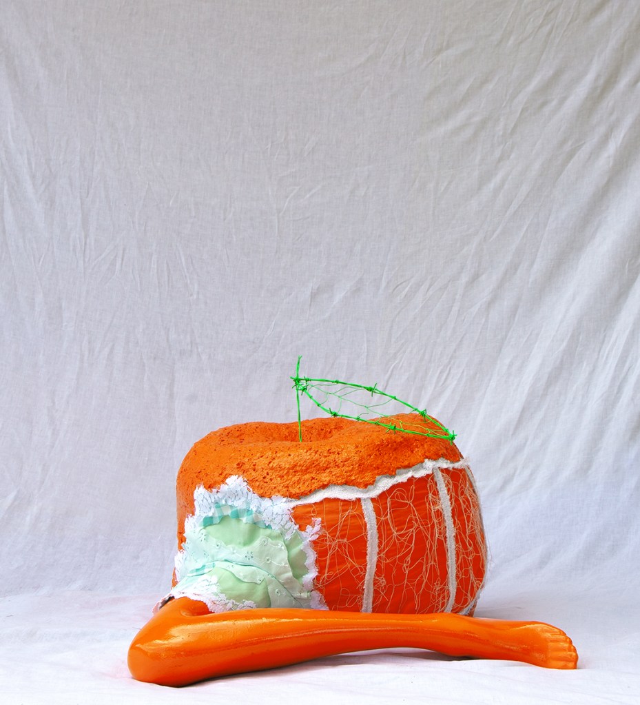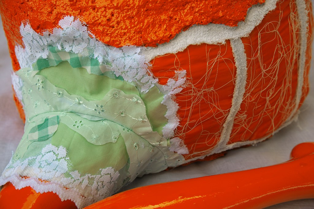 paper mache, recycled fabrics, barbed wire, dumpster dived mannequin leg, acrylic paint, spray paint