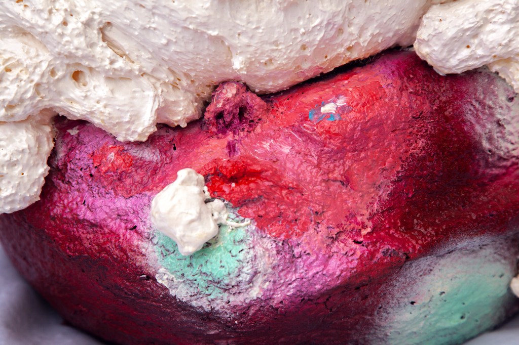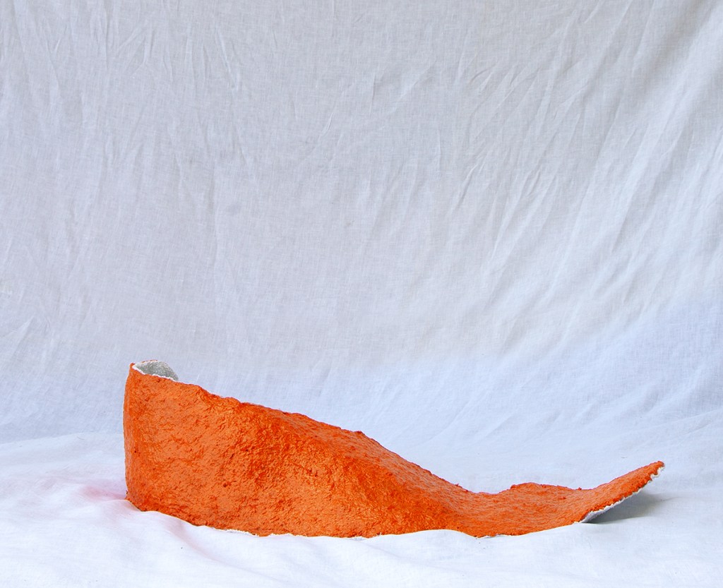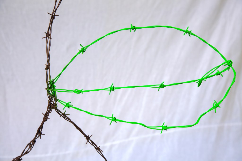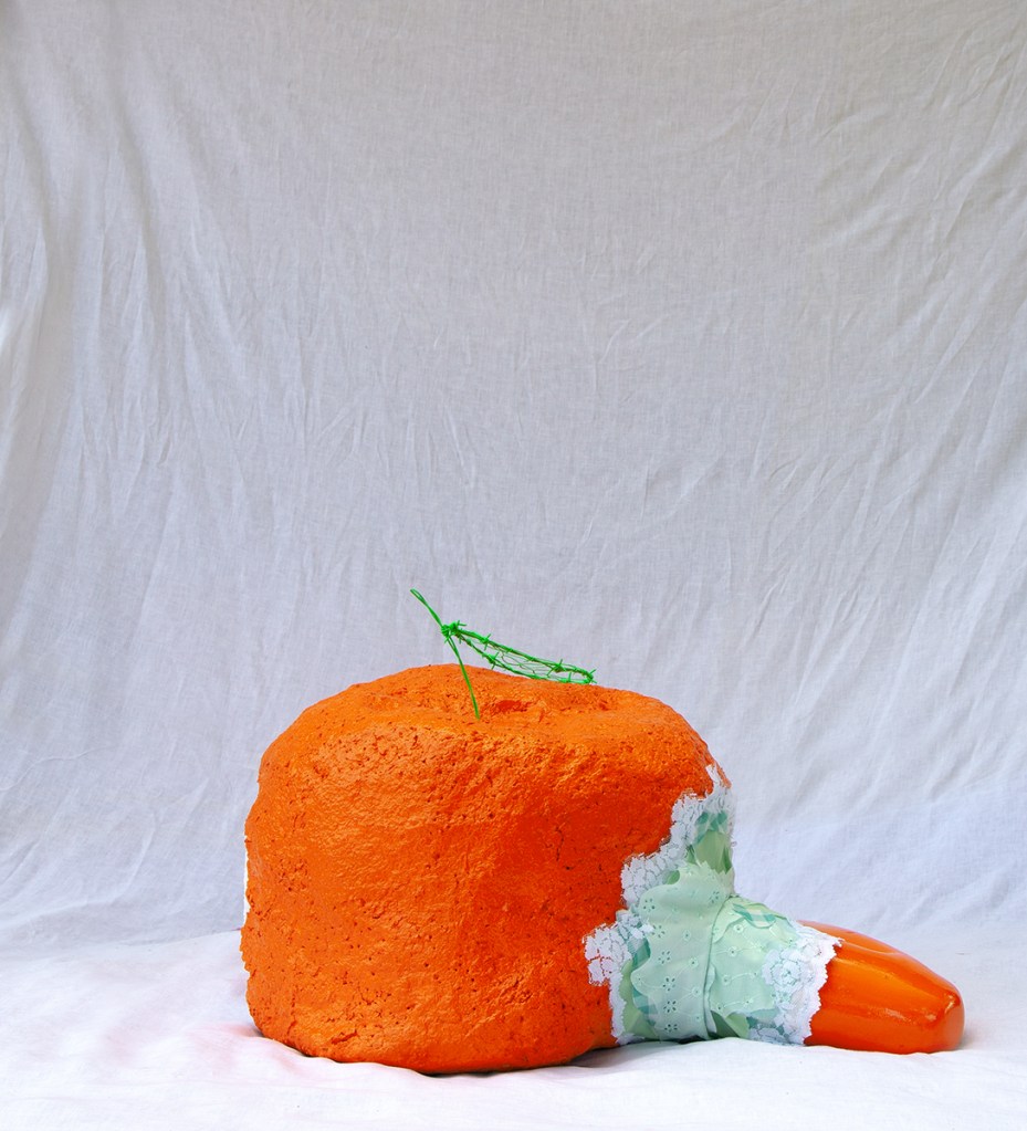 paper mache, recycled fabrics, barbed wire, dumpster dived mannequin leg, acrylic paint, spray paint