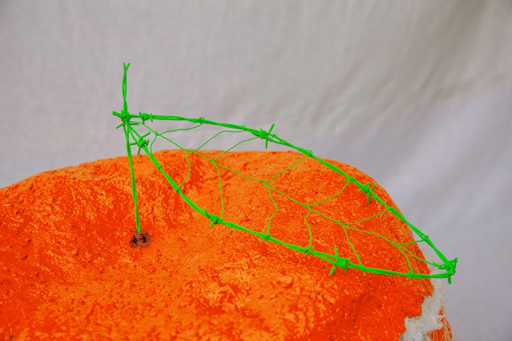 paper mache, polyurethane, acrylic paint, spray paint, barbed wire, one channel video projection
