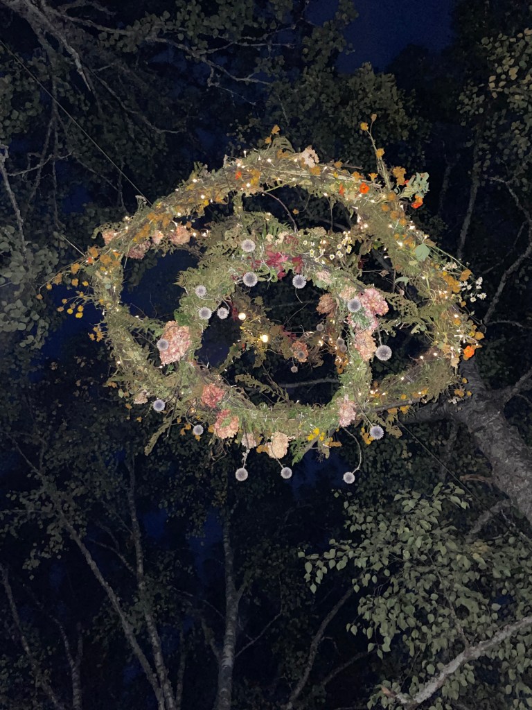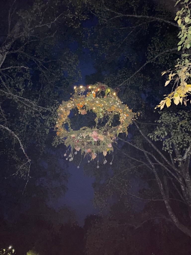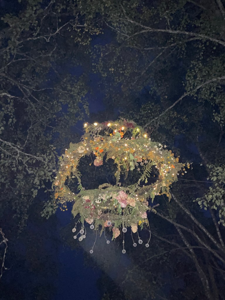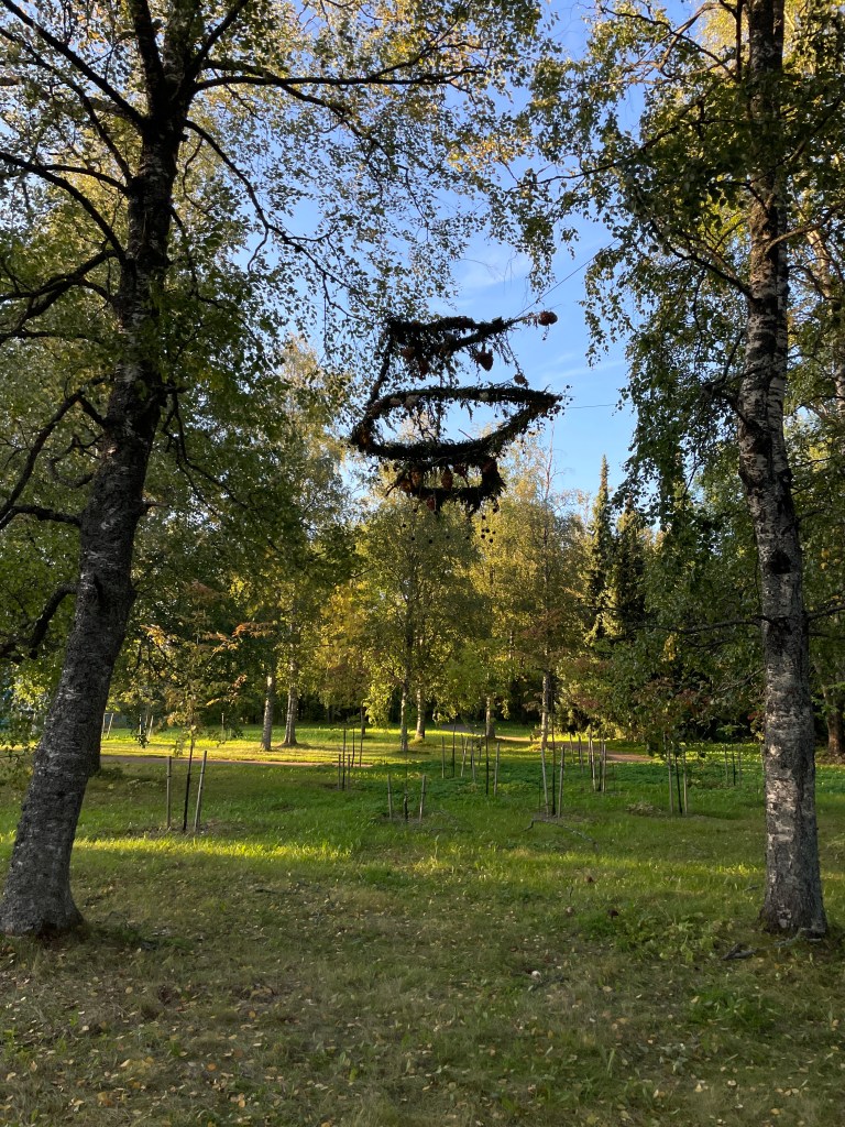 Commissioned by the city of Lappeenranta. Proposal for the artwork was selected for execution from the Kamalan hienoa public art competition 2023. The chandelier was displayed autumn/winter 2023-2024 at the Lappeenranta arboretum where people could see the last flora of the summer used as material slowly wither away into the winter.
